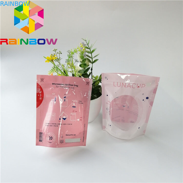 কাস্টমাইজড পুনরায় ব্যবহারযোগ্য মাসিক কাপ প্যাকেজিং ব্যাগ হিট সিলড মাইক্রোওয়েভ স্টেরিলাইজার ব্যাগ সাফ উইন্ডো সহ জিপার ব্যাগ স্ট্যান্ড আপ করুন