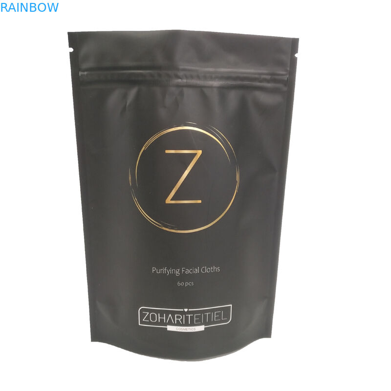 ওএম লোগো স্যাক প্লাস্টিক ব্ল্যাক কালার জিপার সহ ফেসিয়াল ক্লিনজিং ক্লথ কাস্টম স্ট্যান্ড আপ থলি থ্রি প্রসাধনী প্যাকেজিং পাউচ